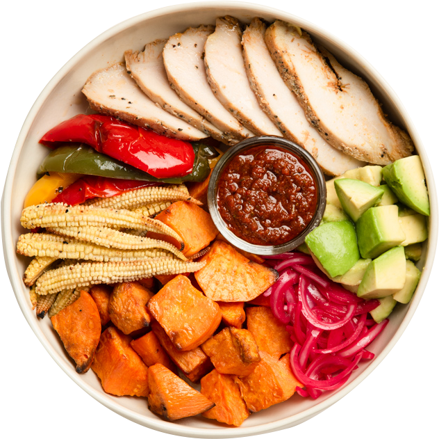 Chipollo is a smoky, spicy chicken bowl loaded with sous-vide chicken, sweet potato base, roasted baby corn, roasted capsicum, avocado, and pickled red onions. It’s tied together with a punchy Chipotle Chimichurri dressing for a balanced, energizing meal.