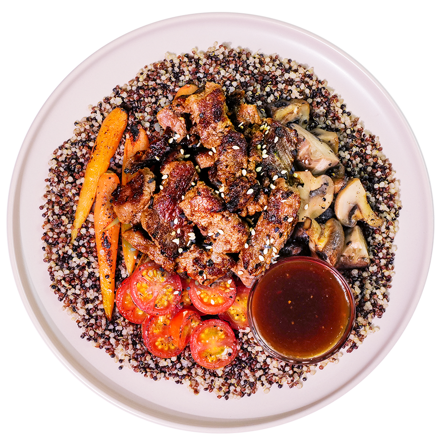 Introducing the Geisha Vu Power Bowl – a delicious mix of sukiyaki beef, organic quinoa, baked mushrooms, charred baby carrots, roasted tomatoes, sesame seeds, and Yuzu Soy. This flavourful bowl offers a perfect balance of protein, fiber, and bold umami taste.