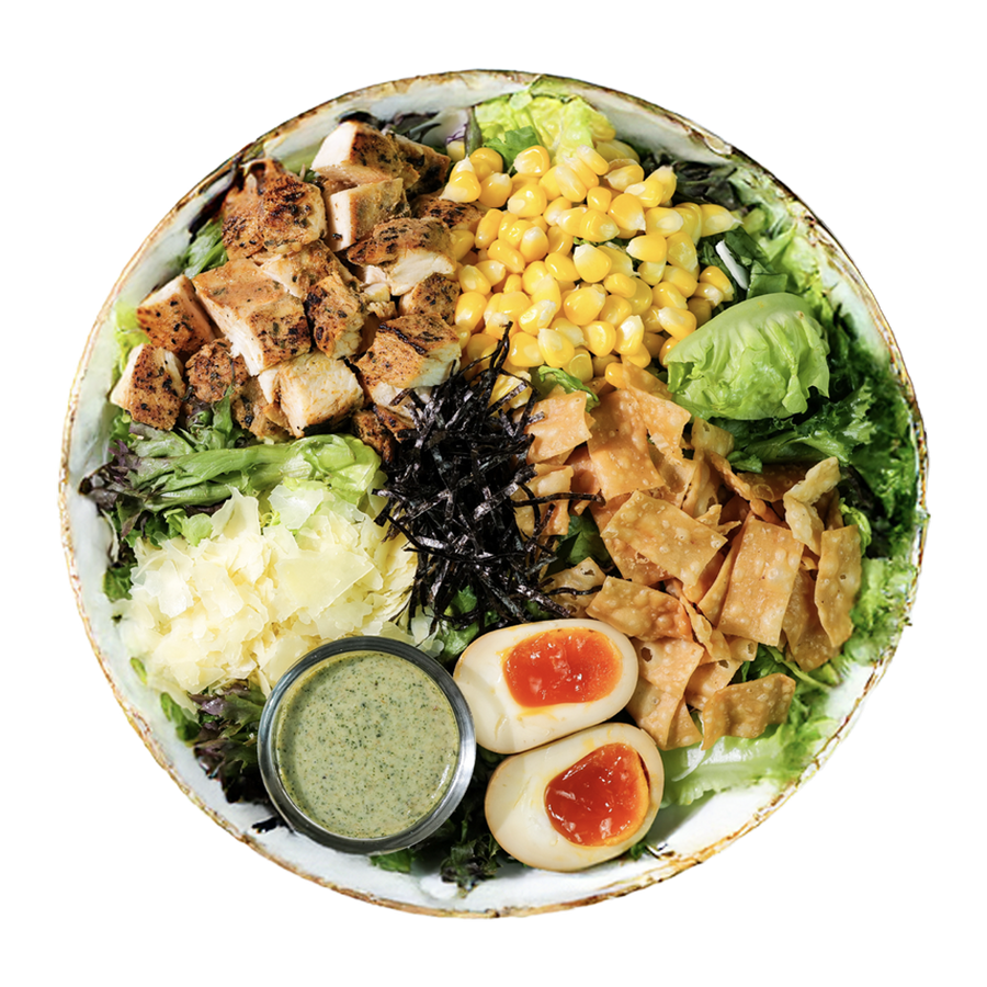 Experience the flavors of Japan with our Hail Shiso salad. Featuring a refreshing mix of greens, tender roasted chicken, soft-boiled egg, parmesan, sweet corn, crispy crackers, and nori, all tossed in a fragrant Shiso Paste. A perfect balance of textures and umami-rich flavors.