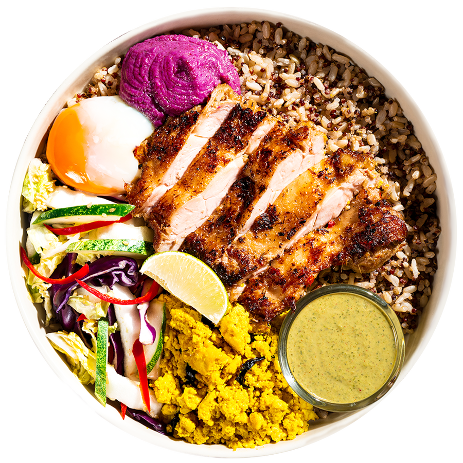 Savour the wholesome goodness of Kampong Table, featuring roasted lemongrass chicken, super grains, basil tofu, onsen egg, oriental cabbage salad, and a zesty lime wedge. This healthy, balanced bowl is complemented by Purple Sweet Potato Dip and Green Goddess dressing for a rich, nutritious experience.