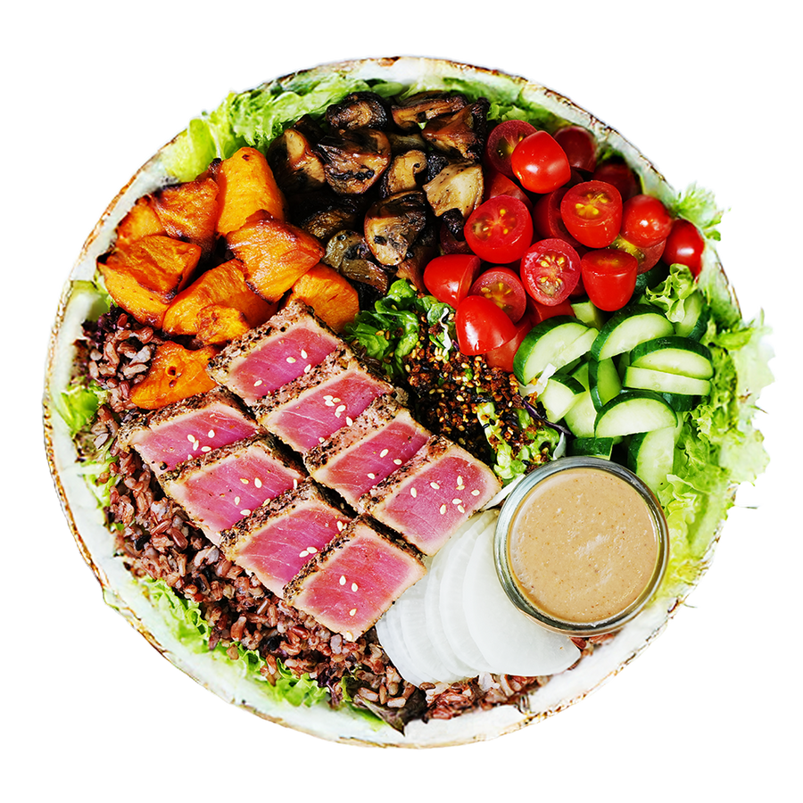Enjoy a taste of Japan with Miso Kiss, a nourishing bowl packed with organic wild rice, fresh mixed greens, seared tuna, baked mushrooms, roasted sweet potatoes, cucumber, cherry tomatoes, radish pickles, and a sprinkle of furikake. Finished with a rich and nutty Walnut Miso dressing, this bowl is a perfect balance of bold Japanese flavors and wholesome ingredients.