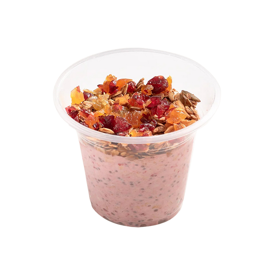 Enjoy the wholesome goodness of our Strawberry Banana Muesli, made with milk, creamy Greek yogurt, rolled oats, strawberry puree, banana, crunchy granola, honey, chia seeds, and dried fruits. This healthy and satisfying snack is perfect for one, making it an ideal option for buffets, seminars, and catering HK events.