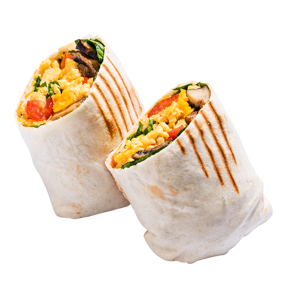 Enjoy a wholesome start with our Veggie Wrap, filled with scrambled eggs, baby spinach, baked mushrooms, parmesan, cheddar, and cherry tomatoes. A tasty grab and go breakfast for a fresh and filling meal.