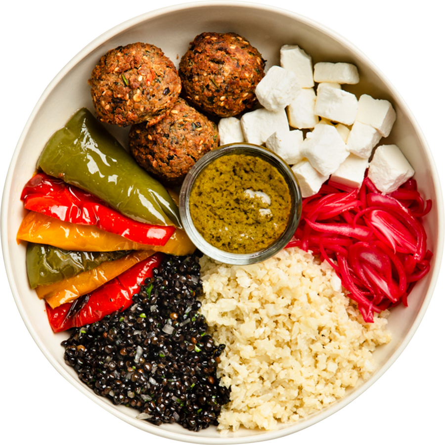 Yallah Mama is a satisfying vegetarian option packed with flavor. This bowl features 3 crispy falafels, cauliflower rice, spiced lentils, roasted capsicum, feta, and pickled red onions, topped with our Green Harissa Vinaigrette. A bold, plant-based powerhouse for any meal.