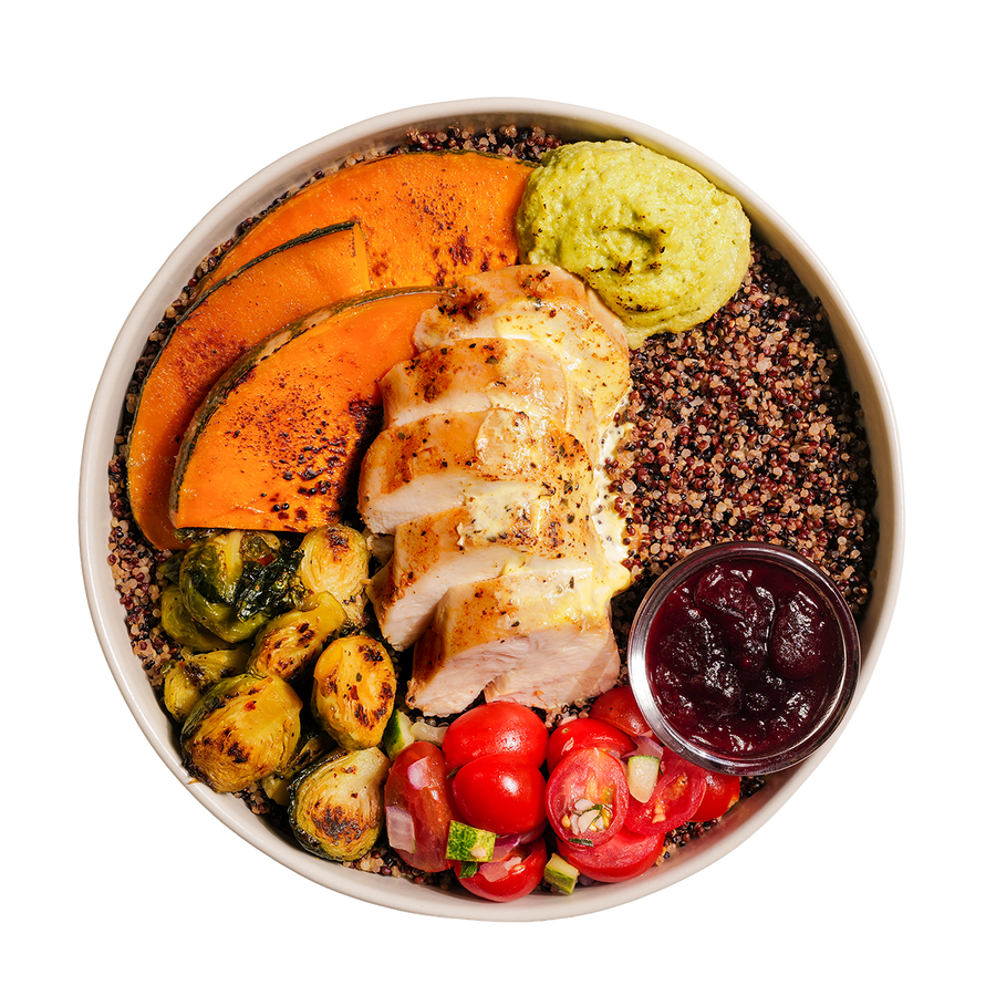Celebrate the season with Holly Jolly, a cozy Christmas bowl featuring tender sous-vide chicken with lemon hollandaise, organic quinoa, and roasted holiday classics like pumpkin and Brussels sprouts. Paired with a refreshing tomato salad, creamy avocado edamame dip, crunchy mixed seeds, and a festive cranberry sauce, it’s a joyful, wholesome bowl made to brighten any holiday meal.